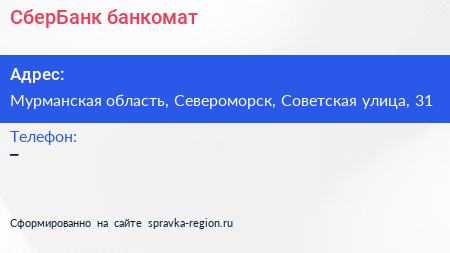 СберБанк, банкомат по адресу Мурманская область, Североморск, Советская улица, 31 в дальнейшем Организация, размещена в следующих категориях: