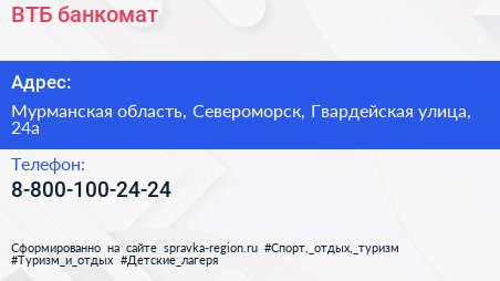 ВТБ, банкомат по адресу Мурманская область, Североморск, Гвардейская улица, 24а в дальнейшем Организация, размещена в следующих категориях: