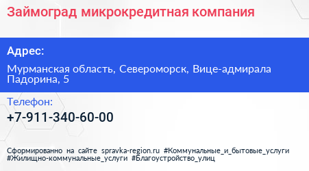 Займоград, микрокредитная компания по адресу Мурманская область, Североморск, Вице-адмирала Падорина, 5 в дальнейшем Организация, размещена в следующих категориях: