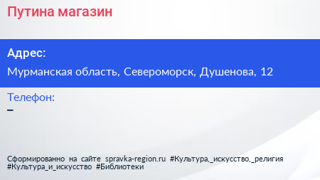 Путина, магазин по адресу Мурманская область, Североморск, Душенова, 12 в дальнейшем Организация, размещена в следующих категориях: