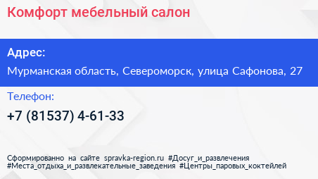 Комфорт, мебельный салон по адресу Мурманская область, Североморск, улица Сафонова, 27 в дальнейшем Организация, размещена в следующих категориях: