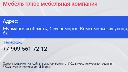 Мебель плюс, мебельная компания по адресу Мурманская область, Североморск, Комсомольская улица, 6а в дальнейшем Организация, размещена в следующих категориях: