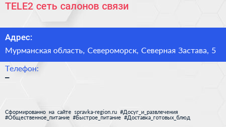 TELE2, сеть салонов связи по адресу Мурманская область, Североморск, Северная Застава, 5 в дальнейшем Организация, размещена в следующих категориях: