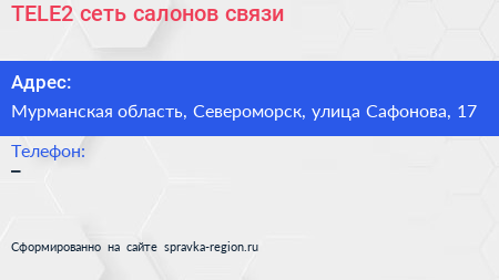 TELE2, сеть салонов связи по адресу Мурманская область, Североморск, улица Сафонова, 17 в дальнейшем Организация, размещена в следующих категориях: