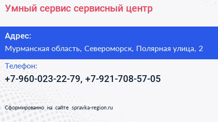 Умный сервис, сервисный центр по адресу Мурманская область, Североморск, Полярная улица, 2 в дальнейшем Организация, размещена в следующих категориях: