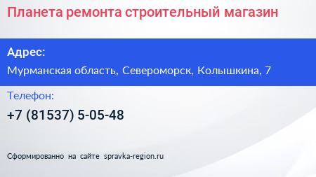 Планета ремонта, строительный магазин по адресу Мурманская область, Североморск, Колышкина, 7 в дальнейшем Организация, размещена в следующих категориях: