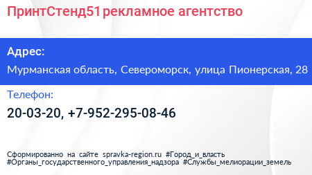 ПринтСтенд51, рекламное агентство по адресу Мурманская область, Североморск, улица Пионерская, 28 в дальнейшем Организация, размещена в следующих категориях: