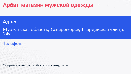 Арбат, магазин мужской одежды по адресу Мурманская область, Североморск, Гвардейская улица, 24а в дальнейшем Организация, размещена в следующих категориях: