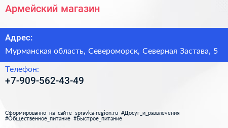 Армейский магазин по адресу Мурманская область, Североморск, Северная Застава, 5 в дальнейшем Организация, размещена в следующих категориях: