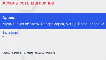 Ассоль, сеть магазинов по адресу Мурманская область, Североморск, улица Ломоносова, 2 в дальнейшем Организация, размещена в следующих категориях:
