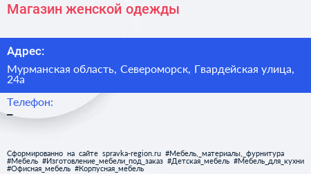 Магазин женской одежды по адресу Мурманская область, Североморск, Гвардейская улица, 24а в дальнейшем Организация, размещена в следующих категориях: