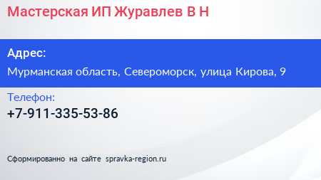 Мастерская, ИП Журавлев В.Н. по адресу Мурманская область, Североморск, улица Кирова, 9 в дальнейшем Организация, размещена в следующих категориях: