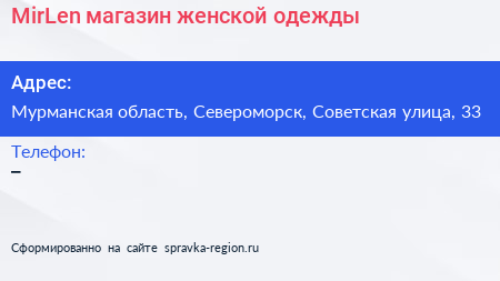MirLen, магазин женской одежды по адресу Мурманская область, Североморск, Советская улица, 33 в дальнейшем Организация, размещена в следующих категориях: