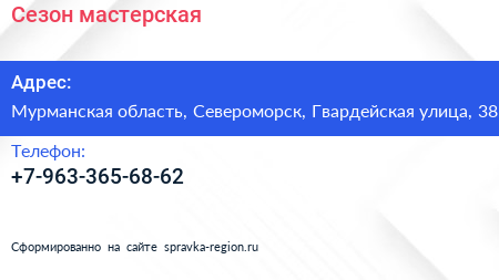 Сезон, мастерская по адресу Мурманская область, Североморск, Гвардейская улица, 38 в дальнейшем Организация, размещена в следующих категориях: