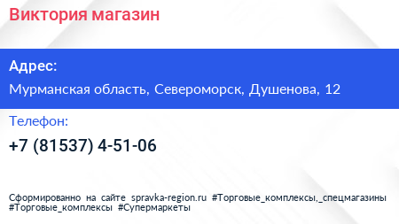 Виктория, магазин по адресу Мурманская область, Североморск, Душенова, 12 в дальнейшем Организация, размещена в следующих категориях: