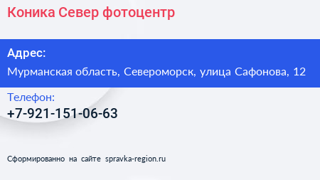Коника Север, фотоцентр по адресу Мурманская область, Североморск, улица Сафонова, 12 в дальнейшем Организация, размещена в следующих категориях: