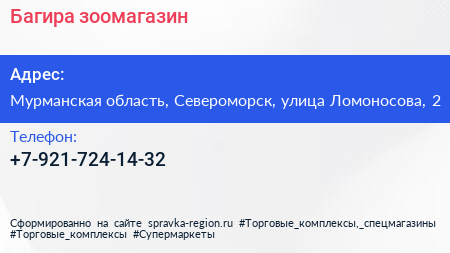 Багира, зоомагазин по адресу Мурманская область, Североморск, улица Ломоносова, 2 в дальнейшем Организация, размещена в следующих категориях: