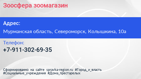 Зоосфера, зоомагазин по адресу Мурманская область, Североморск, Колышкина, 10а в дальнейшем Организация, размещена в следующих категориях: