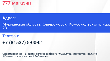 777, магазин по адресу Мурманская область, Североморск, Комсомольская улица, 23 в дальнейшем Организация, размещена в следующих категориях: