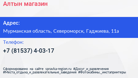 Алтын, магазин по адресу Мурманская область, Североморск, Гаджиева, 11а в дальнейшем Организация, размещена в следующих категориях: