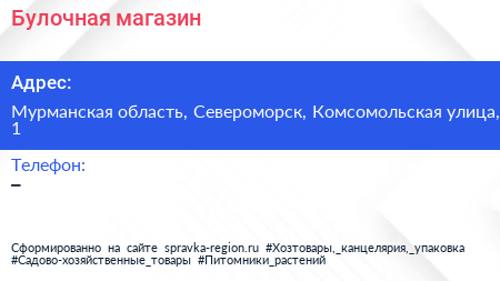 Булочная, магазин по адресу Мурманская область, Североморск, Комсомольская улица, 1 в дальнейшем Организация, размещена в следующих категориях: