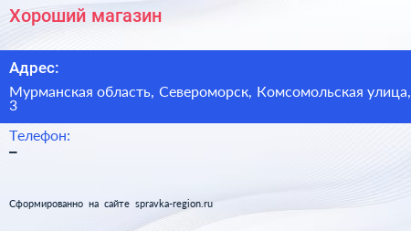 Хороший, магазин по адресу Мурманская область, Североморск, Комсомольская улица, 3 в дальнейшем Организация, размещена в следующих категориях:
