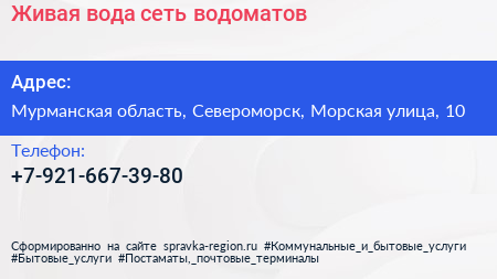 Живая вода, сеть водоматов по адресу Мурманская область, Североморск, Морская улица, 10 в дальнейшем Организация, размещена в следующих категориях: