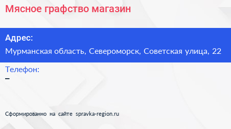 Мясное графство, магазин по адресу Мурманская область, Североморск, Советская улица, 22 в дальнейшем Организация, размещена в следующих категориях: