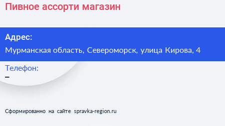 Пивное ассорти, магазин по адресу Мурманская область, Североморск, улица Кирова, 4 в дальнейшем Организация, размещена в следующих категориях: