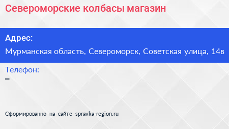 Североморские колбасы, магазин по адресу Мурманская область, Североморск, Советская улица, 14в в дальнейшем Организация, размещена в следующих категориях: