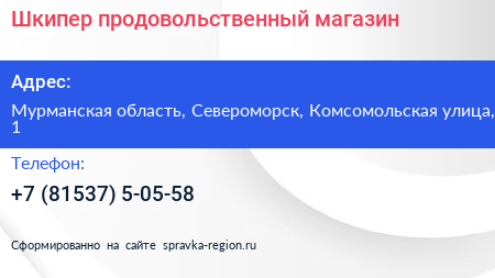 Шкипер, продовольственный магазин по адресу Мурманская область, Североморск, Комсомольская улица, 1 в дальнейшем Организация, размещена в следующих категориях: