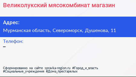 Великолукский мясокомбинат, магазин по адресу Мурманская область, Североморск, Душенова, 11 в дальнейшем Организация, размещена в следующих категориях: