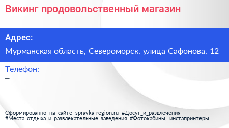 Викинг, продовольственный магазин по адресу Мурманская область, Североморск, улица Сафонова, 12 в дальнейшем Организация, размещена в следующих категориях: