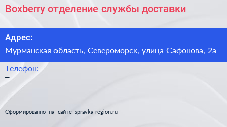 Boxberry, отделение службы доставки по адресу Мурманская область, Североморск, улица Сафонова, 2а в дальнейшем Организация, размещена в следующих категориях: