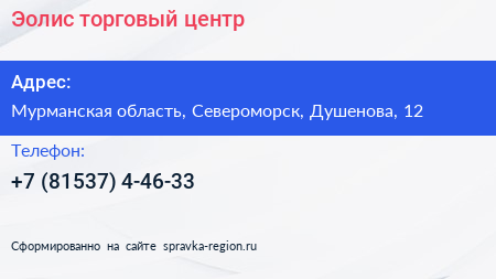 Эолис, торговый центр по адресу Мурманская область, Североморск, Душенова, 12 в дальнейшем Организация, размещена в следующих категориях:
