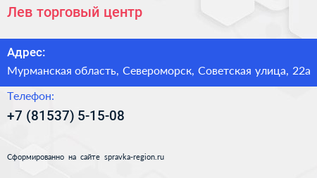 Лев, торговый центр по адресу Мурманская область, Североморск, Советская улица, 22а в дальнейшем Организация, размещена в следующих категориях: