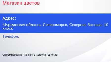 Магазин цветов по адресу Мурманская область, Североморск, Северная Застава, 10 киоск в дальнейшем Организация, размещена в следующих категориях: