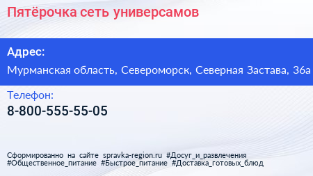 Пятёрочка, сеть универсамов по адресу Мурманская область, Североморск, Северная Застава, 36а в дальнейшем Организация, размещена в следующих категориях: