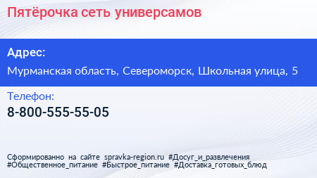 Пятёрочка, сеть универсамов по адресу Мурманская область, Североморск, Школьная улица, 5 в дальнейшем Организация, размещена в следующих категориях: