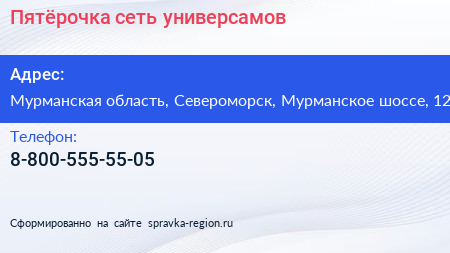 Пятёрочка, сеть универсамов по адресу Мурманская область, Североморск, Мурманское шоссе, 12 в дальнейшем Организация, размещена в следующих категориях: