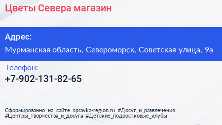 Цветы Севера, магазин по адресу Мурманская область, Североморск, Советская улица, 9а в дальнейшем Организация, размещена в следующих категориях:
