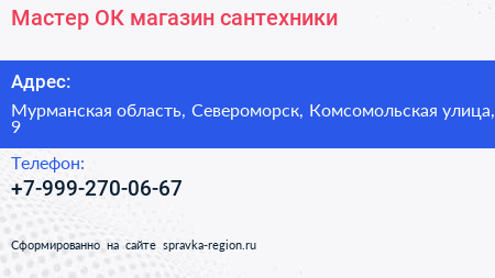 Мастер`ОК, магазин сантехники по адресу Мурманская область, Североморск, Комсомольская улица, 9 в дальнейшем Организация, размещена в следующих категориях: