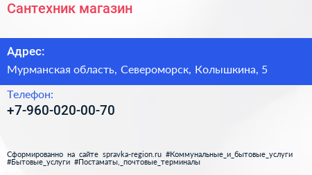 Сантехник, магазин по адресу Мурманская область, Североморск, Колышкина, 5 в дальнейшем Организация, размещена в следующих категориях: