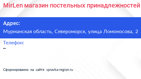 MirLen, магазин постельных принадлежностей по адресу Мурманская область, Североморск, улица Ломоносова, 2 в дальнейшем Организация, размещена в следующих категориях: