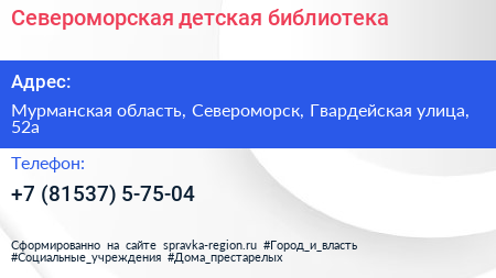 Североморская детская библиотека по адресу Мурманская область, Североморск, Гвардейская улица, 52а в дальнейшем Организация, размещена в следующих категориях: