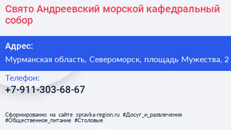 Свято-Андреевский морской кафедральный собор по адресу Мурманская область, Североморск, площадь Мужества, 2 в дальнейшем Организация, размещена в следующих категориях: