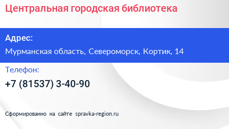 Центральная городская библиотека по адресу Мурманская область, Североморск, Кортик, 14 в дальнейшем Организация, размещена в следующих категориях: