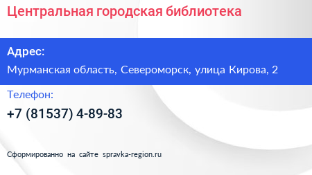 Центральная городская библиотека по адресу Мурманская область, Североморск, улица Кирова, 2 в дальнейшем Организация, размещена в следующих категориях: