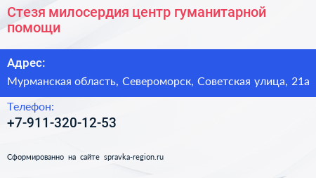 Стезя милосердия, центр гуманитарной помощи по адресу Мурманская область, Североморск, Советская улица, 21а в дальнейшем Организация, размещена в следующих категориях: