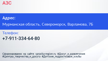 АЗС по адресу Мурманская область, Североморск, Варламова, 7Б в дальнейшем Организация, размещена в следующих категориях: